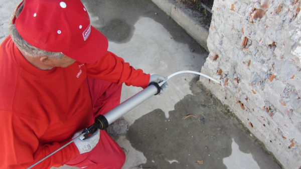 Injecció d'emulsió a base de silans i siloxans, Maxclear Injection Cream "DRIZORO", prèvia realització de perforacions horitzontals en els junts, en murs de maçoneria o de fàbrica de maó ceràmic massís, per a tractament d'humitats per capil·laritat. Inclús morter tixòtrop, d'enduriment ràpid, Maxrest "DRIZORO", per al segellat de forats. | ||